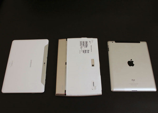 Слева - Samsung Galaxy Tab 10.1, справа - iPad 2, посередине ASUS Slider. Сзади, а точнее, снизу мы видим сочетание металла и пластика, что несомненно пошло на пользу планшету. Снизу располагаются 5 ножек (2 на пластиковой части и 3 на металлической полосе) против скольжения.