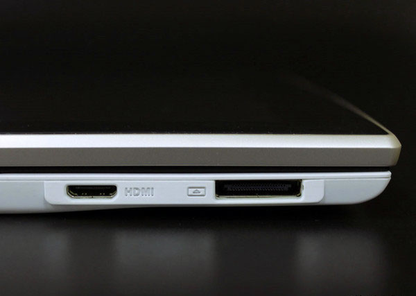 Итак, сверху у слайдера находится 2 разеъема: mini-HDMI и разъем для зарядки. HDMI означает, что при подключении переходника, изображение с планшета можно транслировать на любое устройство, которое имеет поддержку HDMI. Порт зарядки же не стандартный, то есть подзарядить планшет в гостях не получится, придется таскать с собой провод.