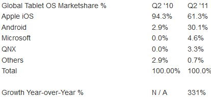 После Android 30% третье место заняла Microsoft с 4,6%. Strategy Analytics утверждает, что Research in Motion (RIM) с её планшетом PlayBook на базе QNX удалось захватить лишь 3,3% рынка. Аналитики полагают, что причиной относительно малой популярности PlayBook первого поколения стали проблемы с дизайном продукта, касающиеся поддержки электронной почты.