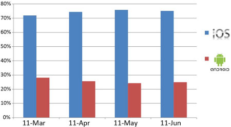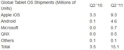 По данным аналитической компании Strategy Analytics, планшеты Android занимали 30% мировых поставок планшетов во втором квартале против 61% у Apple. Strategy Analytics сообщает, что поставки планшетов во втором квартале текущего года составили 15 млн единиц, то есть возросли на 331% с 3,5 млн в том же периоде прошлого года. Хотя iPad по-прежнему лидирует с долей в 61%, однако по сравнению с прошлым годом (94%) преимущество Apple уже не столь разительное.